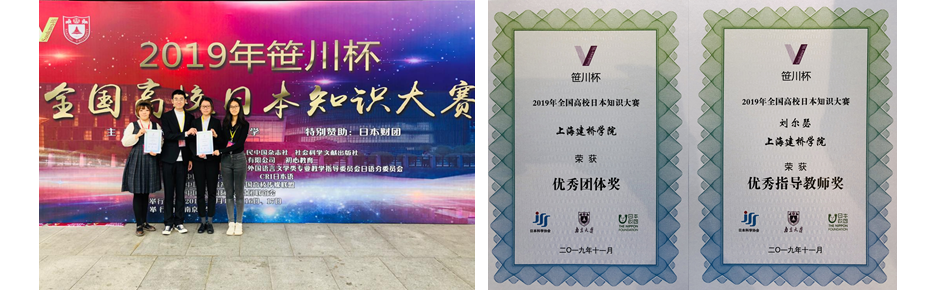 11月15日至17日,由日本财团特别赞助、公益财团法人日本科学协会与南京大学共同主办的2019年“笹川杯”全国高校日本知识大赛在南京大学仙林校区举行。我校外国语学院2017级日语专业的吴超燕、樊家鸣、代琰同学获“团体优胜奖”,指导老师刘尔瑟获“优秀指导教师奖”。